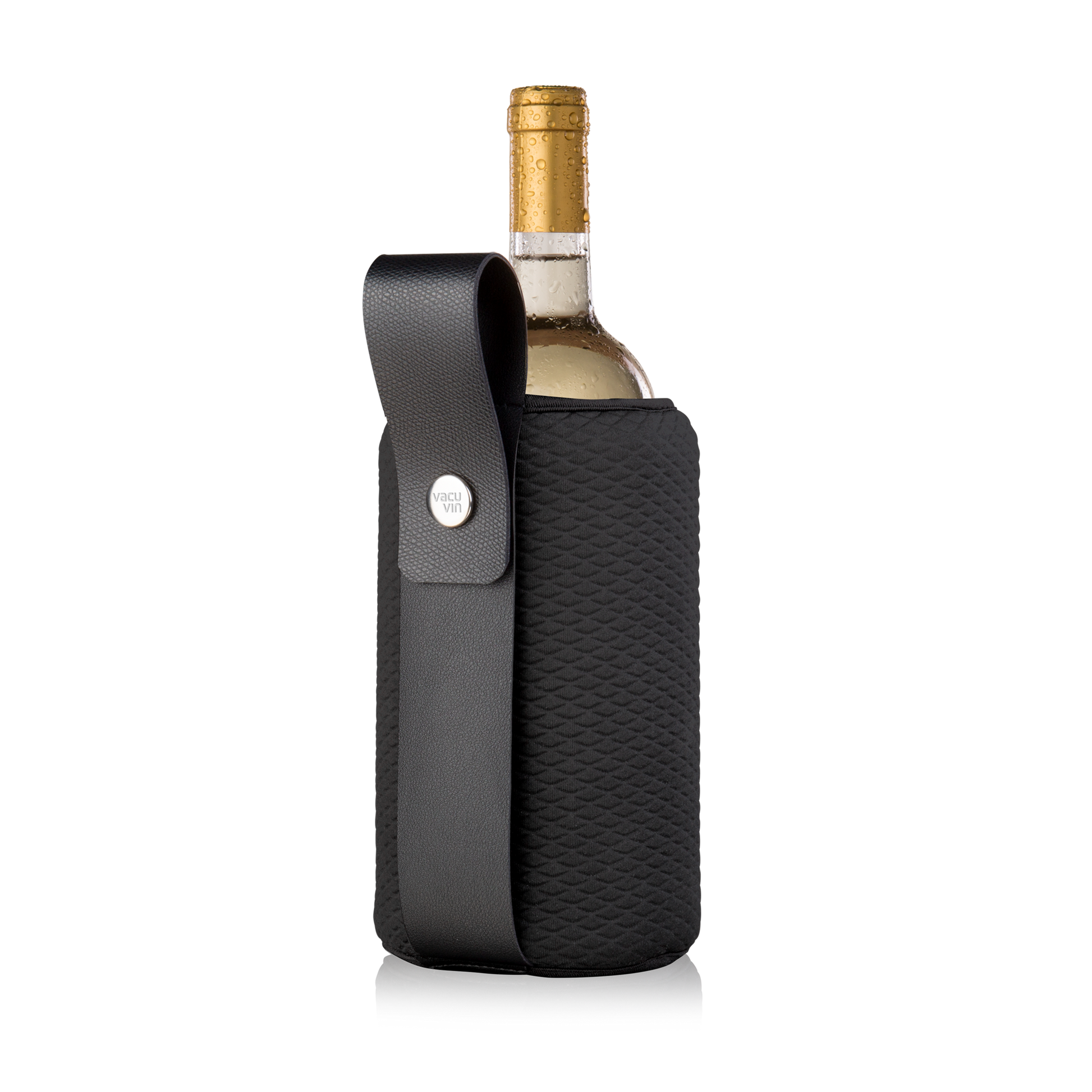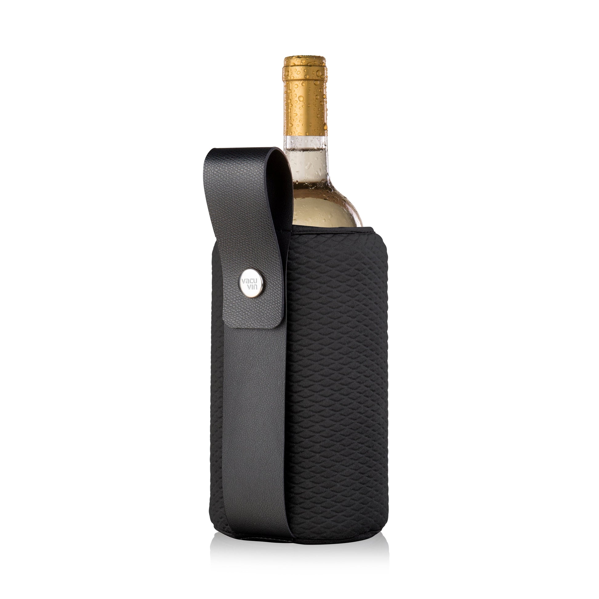The Vacu Vin Flexible Wine Cooler Artico chills your wine or champagne quickly and keeps it cool for longer. The Flexible Wine Cooler Artico is an Active Cooler for both wine and champagne bottles. With the active cooling technique the Flexible Wine Cooler Artico chills your drinks quickly and keeps it cool until the last sip. The neoprene sleeve and leather strip gives this cooler a premium appearance. Keep the wine cooler in your freezer to always enjoy a chilled drink!